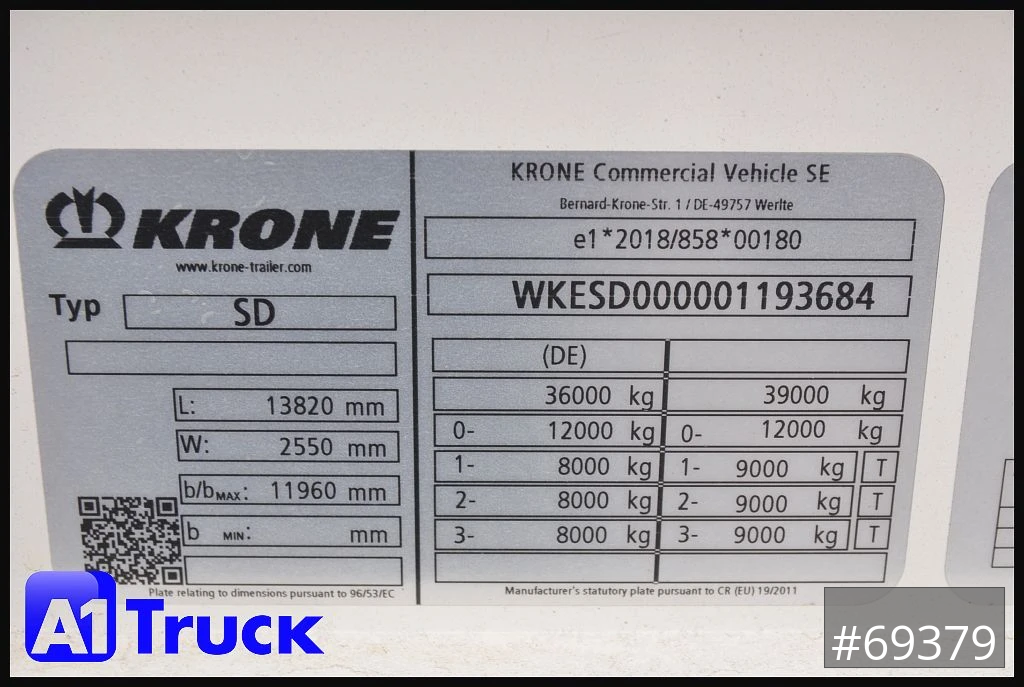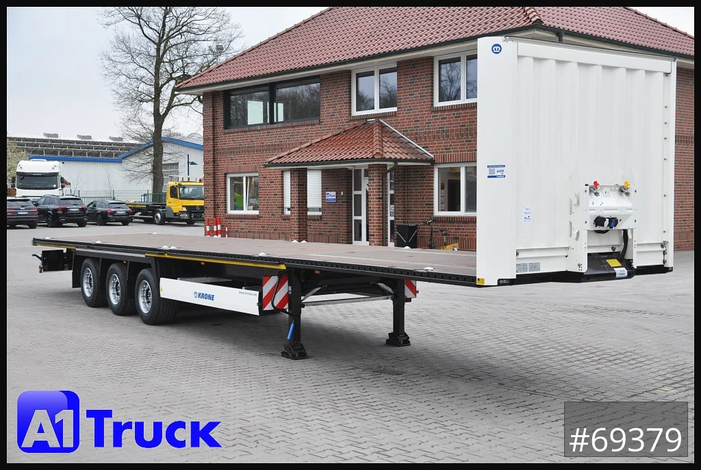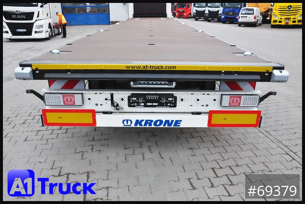 Krone SD Mega Plattform, Containerverriegelung, Containeraufnahme;1 x 40 / 2 x 20 / 1 x 20' mittig, REIFENHERSTELLER: Good Year, Rundumleuchte, Arbeitsscheinwerfer, 2 Warntafeln ECE R70, 2 Satz Überbreitenschilder, Rungendepot für 12 Steckrungen, starker 30mm Boden / bis 7000kg Staplerachslast, Dokumentenbox, Wabco Bremsanlage