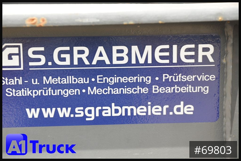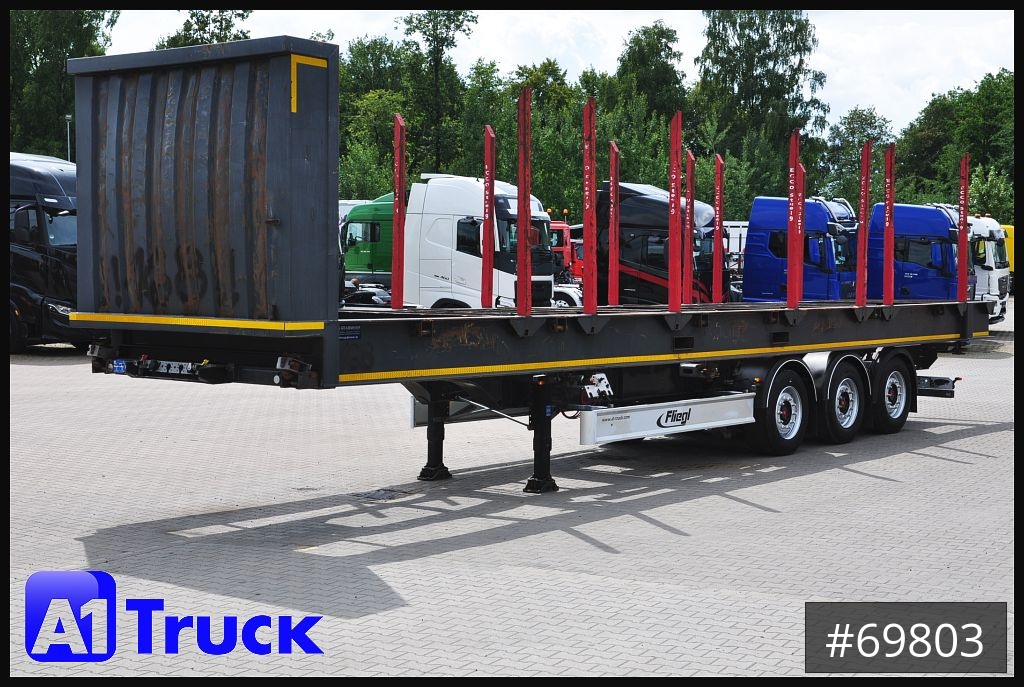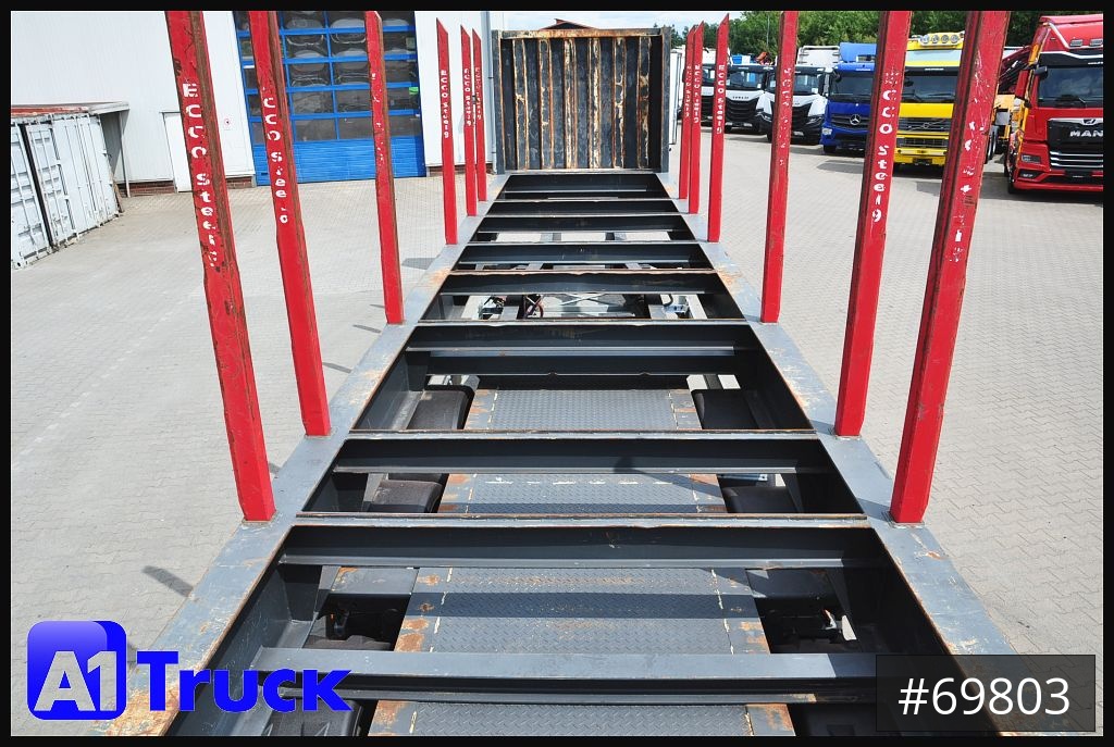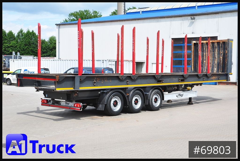 Fliegl Cotainerchassi, Container-Plattform 40" für Holz, & Metall,Hersteller S Grabmeier, Leergewicht 4600 Kg,Stirnwandhöhe: 2040 mm, 6x paar Zurrringe für Bahnverladung, Rahmenhöhe: 500 mm,Holzaufbau 8 paar Ecco Steel Rungen auf Containerchassi, Rungenhöhe 1980mm, Hightlight: Liftachse/ Holztransport/ SAF Achse//