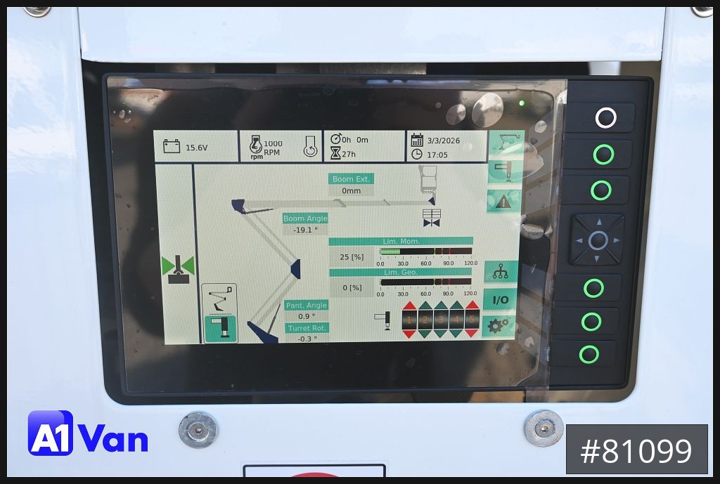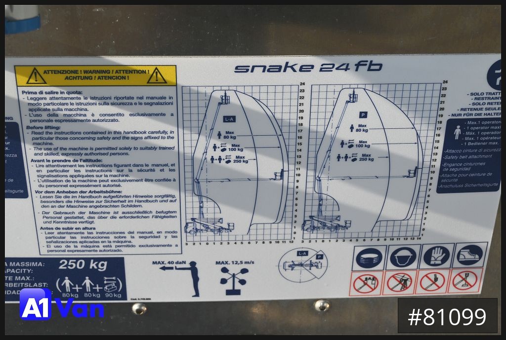 Oil & Steel Snake 24, 3 Sitze, Korb- und Flursteuerung, Arbeitshöhe: 235 m, Standhöhe: 215 m, Tragfähigkeit Plattform: 250 kg, Seitliche Reichweite: 130 m, Arbeitskorb: 1400 x 700 x 1100 mm, Schwenkbereich: 400°, Korbdrehung: +/- 90° , Abstützung: H-Abstützungzul Gesamtgewicht: 3490 kg
